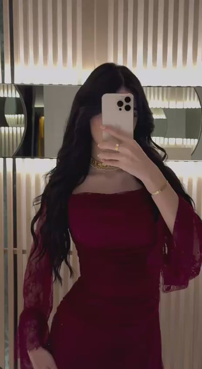 فستان دانتيل ماروني أنيق بتصميم فاخر يعكس الأنوثة والأناقة. يتميز بأكمام مصممة بدقة، وياقة أنيقة، وطول مثالي لمظهر راقٍ وأنيق. متوفر بجميع الأحجام.